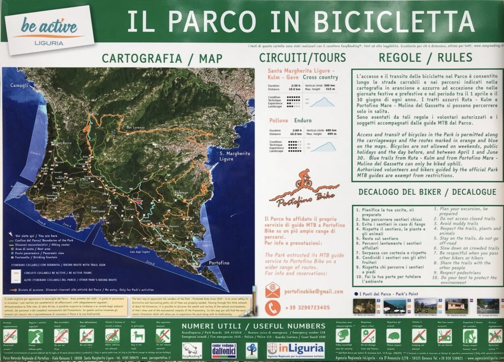 Blue trails from Ruta – Kulm and from Portofino Mare – Mulino del Gassetta can only be biked uphill.